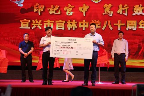 宜興市官林中學(xué)80周年校慶活動(dòng)即日舉行,官林中學(xué)4只冠名基金揭牌儀式同時(shí)舉行。江潤(rùn)銅業(yè)總經(jīng)理駱偉棟參加了此次盛會(huì),向母校捐贈(zèng)200萬元設(shè)立教育獎(jiǎng)勵(lì)基金。江潤(rùn)銅業(yè)與三川投資、永友糧油、江南電纜一起凝聚力量,致力推動(dòng)教育事業(yè)發(fā)展。