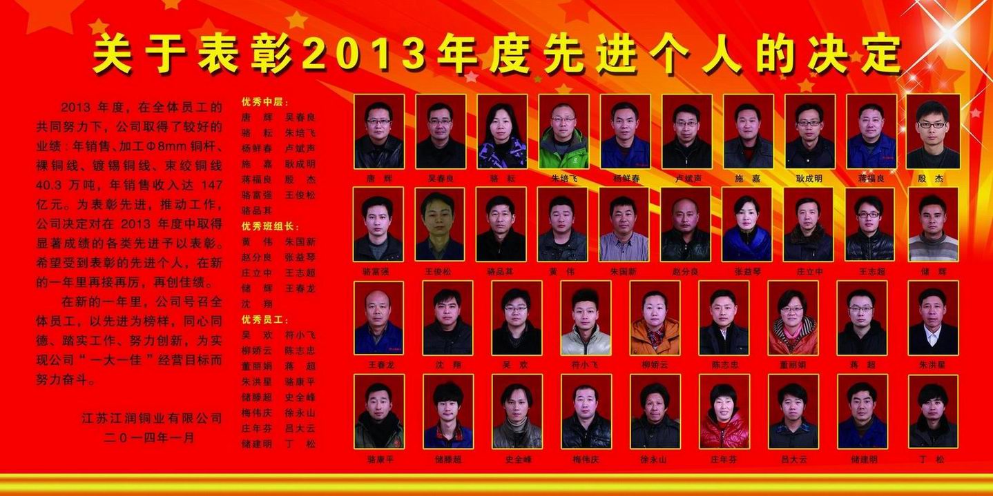 2013年度,在全體員工的共同努力下,公司取得了較好的業(yè)績:年銷售、加工Φ8mm銅桿、裸銅線、鍍錫銅線、束絞銅線40.3萬噸,年銷售收入達147億元。為表彰先進,推動工作,公司決定對在2013年度中取得顯著成績的各類先進予以表彰。希望受到表彰的先進個人,在新的一年里再接再厲,再創(chuàng)佳績。在新的一年里,公司號召全體員工,以先進為榜樣,同心同德、踏實工作、努力創(chuàng)新,為實現(xiàn)公司“一大一佳”經(jīng)營目標(biāo)而努力奮斗。優(yōu)秀中層:唐 輝、吳春良、駱 耘、朱培飛、楊鮮春、盧斌聲、施 嘉、耿成明、蔣福良殷 杰、駱富強、王俊松、駱品其優(yōu)秀班組長:黃 偉、朱國新、趙分良、張益琴、莊立中、王志超、儲 輝、王春龍、沈 翔優(yōu)秀員工:吳 歡、符小飛、柳嬌云、陳志忠、董麗娟、蔣 超、朱洪星、駱康平、儲滕超史全峰、梅偉慶、徐永山、莊年芬、呂大云、儲建明、丁 松