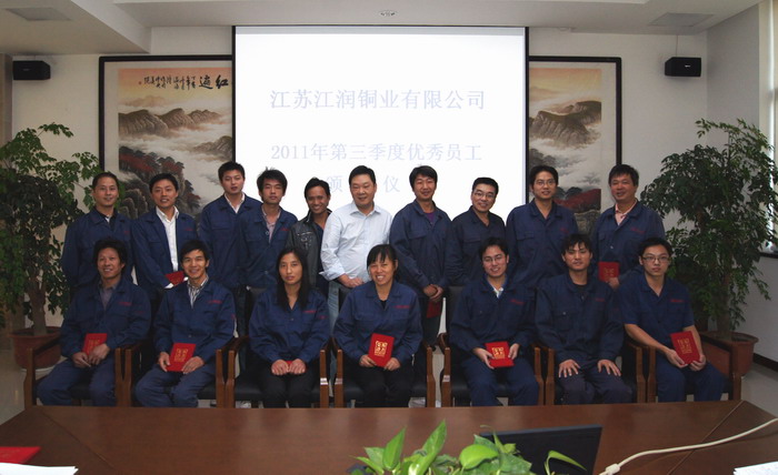 10月16日下午,在江潤(rùn)銅業(yè)辦公樓一樓大會(huì)議室,總經(jīng)理駱偉棟主持召開(kāi)了2011年第三季度優(yōu)秀員工表彰大會(huì)。三季度共評(píng)選出17名優(yōu)秀員工,其中15名來(lái)自生產(chǎn)一線(xiàn)。駱總表示,上下一心,共同努力,實(shí)現(xiàn)企業(yè)與個(gè)人的共同發(fā)展。